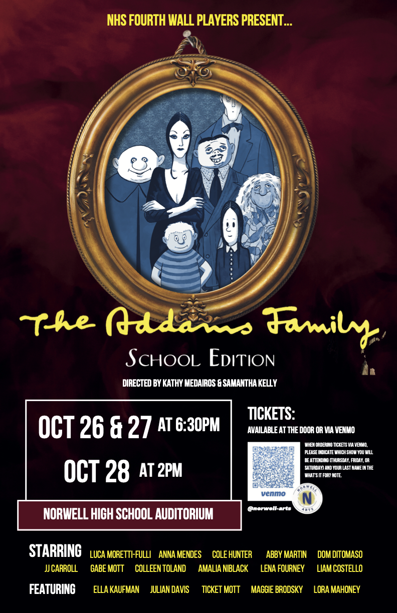 Come see The Addams Family The Musical at Norwell High School, October 26th and 27th at 6:30 PM, and the 28th at 2 PM. Tickets can be purchased at the door or by Venmo @norwell-arts